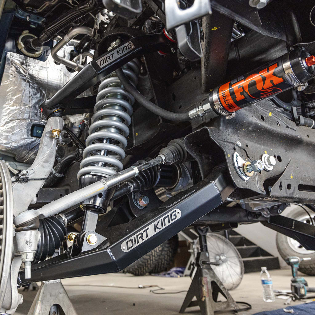 The Dirt King Long Travel Suspension System is engineered to dramatically enhance off-road handling while maintaining excellent day-to-day drivability. Up front the system delivers 13” of travel and supports up to a 37” tire offering substantial improvements in articulation and clearance. Designed for both 2WD and 4WD models when paired with extended axle shafts. Compared to the competition we’ve gained several inches of ground clearance by mounting the lower arms in the factory location instead of below it. The system is fully CAD-designed, rigorously tested, and proudly manufactured in the USA.