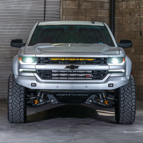 The Dirt King prerunner bumper is a perfect addition to any off-road Silverado 1500 or Sierra 1500. It gives the front end that finishing touch as well as providing a strong structure to withstand the punishment seen in off-roading. The bumper is CAD designed and constructed with DOM tubing. We offer several options allowing you to customize it to your preferences. The standard bumper comes raw metal with an aluminum Dirt King skid plate. This bumper bolts into the factory holes on the frame and works with a trimmed factory bumper shell or our high clearance fiberglass bumper shell. Most 2016-2018 Silverado's didn't come equipped without fog lights so we offer the correct bumper shell that can be purchased along with the tubular bumper. If you plan on installing this bumper with the Fiberwerx fenders and valance you will need to custom mount lights to fill the void. Returns or cancelations on powder coated bed cages are subject to a 10% restocking fee.