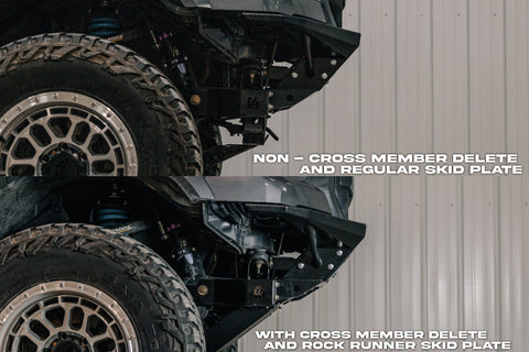 - If you opt for the cross member delete, you will receive a replacement cross member, rock runner front skid plate, and power steering relocation kit.